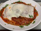 Chicken breast topped with tomato basil sauce, mozzarella, and parmesan cheese over pasta.